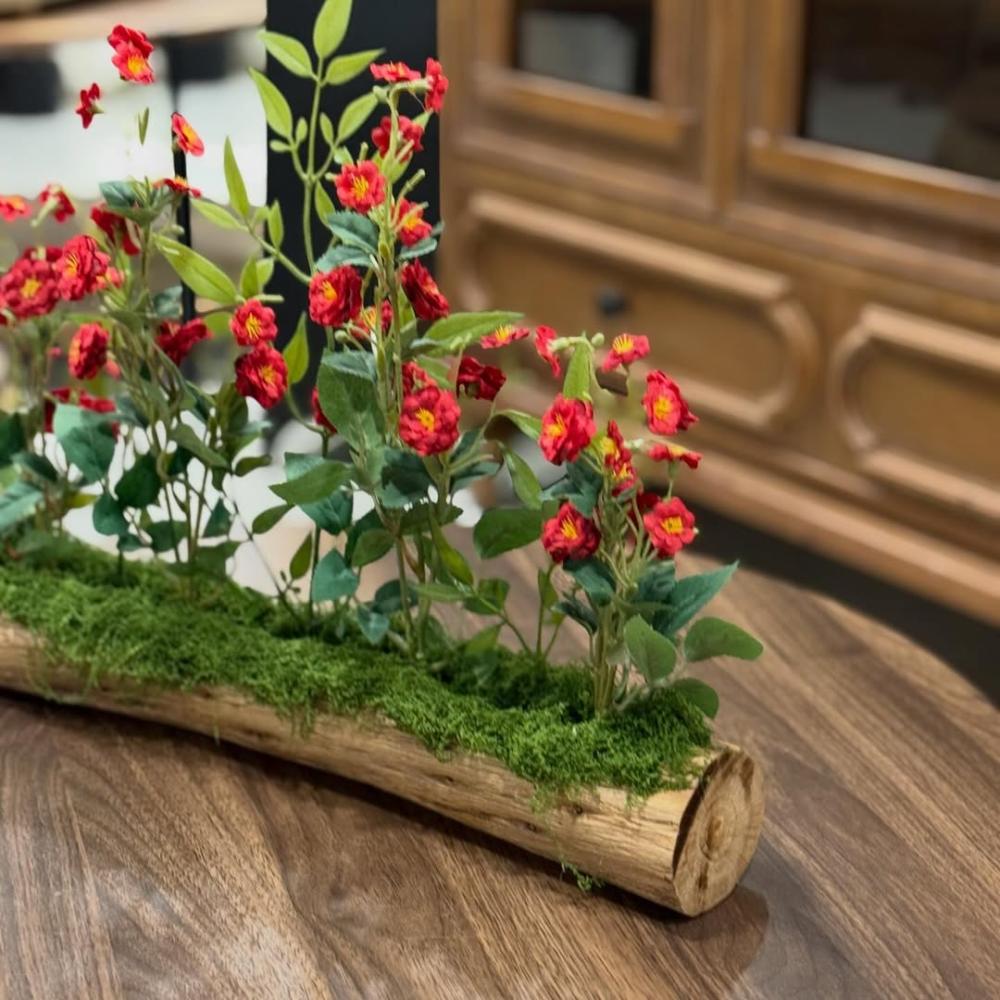 قطعة مميزة مصنوعة من جذع خشب طبيعي مجفف بتفاصيله العفوية التي تعكس جمال الطبيعة، مزين بـ ورود صناعية بجودة عالية بألوان زاهية تضيف لمسة حياة وبهجة للمكان.